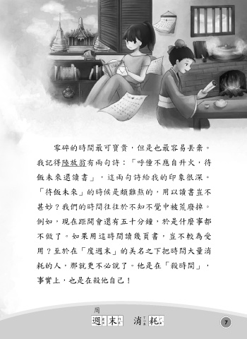 零碎的時間最可寶貴,但是也最容易丟棄。 我記得陸放翁有兩句詩:「呼僮不應自升火,待 飯未來還讀書」,這兩句詩給我的印象很深。 「待飯未來」的時候是頗難熬的,用以讀書豈不 甚妙?我們的時間往往於不知不覺中被荒廢掉。 例如,現在距開會還有五十分鐘,於是什麼事都 不做了。如果用這時間讀幾頁書,豈不較為受 用?至於在「度週末」的美名之下把時間大量消 耗的人,那就更不必說了。他是在「殺時間」, 事實上,也是在殺他自己! 週 週末 消耗 7