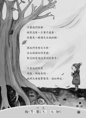 只要我們有根, 縱然沒有一片葉子遮身, 仍舊是一株頂天立地的樹。 讓我們更堅定不移, 在北風裡站得更穩, 堅忍地度過這凜冽的寒冬。 只要我們有根, 明春,明春來時, 我們又會枝繁葉茂,宛如新生。 葉 茂 枝繁葉茂 宛如 25