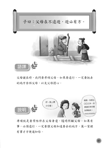 子曰:父母在不遠遊,遊必有方。 語譯 父母健在時,我們要孝順父母,如果要遠行,一定要把去 的地方告訴父母,以免父母擔心。 說明 孝順就是要常陪伴在父母身邊,隨時照顧父母。如果有 事,必須遠行,一定要讓父母知道要去的地方,萬一家裡 有事才方便通知你。 51