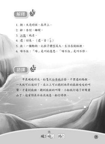 聲。才看到猿猴,聽到猿猴的叫聲,小船就行過了好幾重