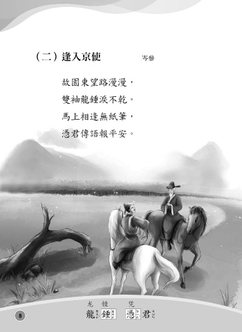 (二)逢入京使 岑參 故園東望路漫漫, 雙袖龍鍾淚不乾。 馬上相逢無紙筆, 憑君傳語報平安。 龍 鍾 憑 8 龍鍾 憑君