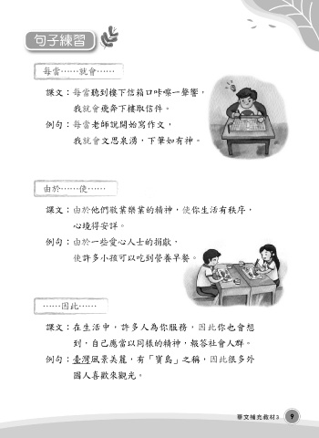 句子練習 每當……就會…… 課文: 每當聽到樓下信箱口咔嚓一聲響, 我就會飛奔下樓取信件。 例句: 每當老師說開始寫作文, 我就會文思泉湧,下筆如有神。 由於……使…… 課文: 由於他們敬業樂業的精神,使你生活有秩序, 心境得安詳。 例句: 由於一些愛心人士的捐獻, 使許多小孩可以吃到營養早餐。 ……因此…… 課文: 在生活中,許多人為你服務,因此你也會想 到,自己應當以同樣的精神,報答社會人群。 例句: 臺灣風景美麗,有「寶島」之稱,因此很多外 國人喜歡來觀光。 華文補充教材3 9