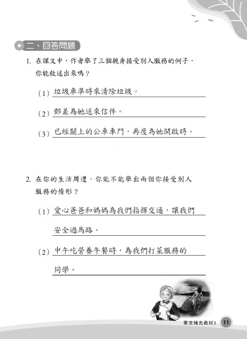 二、回答問題 1. 在課文中,作者舉了三個親身接受別人服務的例子, 你能敘述出來嗎? 垃圾車準時來清除垃圾。 (1) 郵差為她送來信件。 (2) 已經關上的公車車門,再度為她開啟時。 (3) 2. 在你的生活周遭,你能不能舉出兩個你接受別人 服務的情形? 愛心爸爸和媽媽為我們指揮交通,讓我們 (1) 安全過馬路。 中午吃營養午餐時,為我們打菜服務的 (2) 同學。 華文補充教材3 11