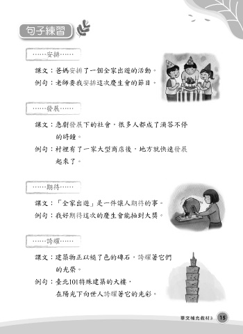 句子練習 ……安排…… 課文:爸媽安排了一個全家出遊的活動。 例句:老師要我安排這次慶生會的節目。 ……發展…… 課文: 急劇發展下的社會,很多人都成了滴答不停 的時鐘。 例句: 村裡有了一家大型商店後,地方就快速發展 起來了。 ……期待…… 課文: 「全家出遊」是一件讓人期待的事。 例句: 我好期待這次的慶生會能抽到大獎。 ……誇耀…… 課文: 建築物正以褪了色的磚石,誇耀著它們 的光榮。 例句: 臺北101特殊建築的大樓, 在陽光下向世人誇耀著它的光彩。 華文補充教材3 15