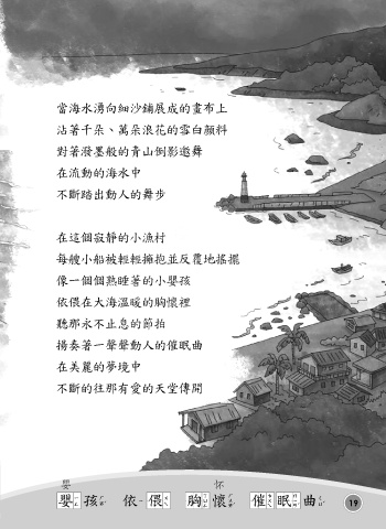 當海水湧向細沙鋪展成的畫布上 沾著千朵、萬朵浪花的雪白顏料 對著潑墨般的青山倒影邀舞 在流動的海水中 不斷踏出動人的舞步 在這個寂靜的小漁村 每艘小船被輕輕擁抱並反覆地搖擺 像一個個熟睡著的小嬰孩 依偎在大海溫暖的胸懷裡 聽那永不止息的節拍 揚奏著一聲聲動人的催眠曲 在美麗的夢境中 不斷的往那有愛的天堂傳開 嬰 懷 嬰孩 依偎 胸懷 催眠曲 19