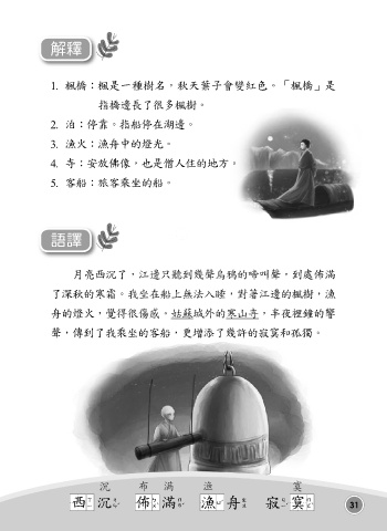 解釋 1. 楓橋: 楓是一種樹名,秋天葉子會變紅色。「楓橋」是 指橋邊長了很多楓樹。 2. 泊:停靠。指船停在湖邊。 3. 漁火:漁舟中的燈光。 4. 寺:安放佛像,也是僧人住的地方。 5. 客船:旅客乘坐的船。 語譯 月亮西沉了,江邊只聽到幾聲烏鴉的啼叫聲,到處佈滿 了深秋的寒霜。我坐在船上無法入睡,對著江邊的楓樹,漁 舟的燈火,覺得很傷感。姑蘇城外的寒山寺,半夜裡鐘的響 聲,傳到了我乘坐的客船,更增添了幾許的寂寞和孤獨。 沉 佈 滿 漁 寞 西沉 佈滿 漁舟 寂寞 31