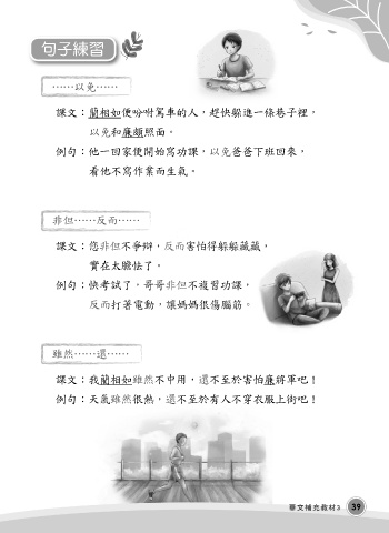 句子練習 ……以免…… 課文: 藺相如便吩咐駕車的人,趕快躲進一條巷子裡, 以免和廉頗照面。 例句: 他一回家便開始寫功課,以免爸爸下班回來, 看他不寫作業而生氣。 非但……反而…… 課文: 您非但不爭辯,反而害怕得躲躲藏藏, 實在太膽怯了。 例句: 快考試了,哥哥非但不複習功課, 反而打著電動,讓媽媽很傷腦筋。 雖然……還…… 課文: 我藺相如雖然不中用,還不至於害怕廉將軍吧! 例句: 天氣雖然很熱,還不至於有人不穿衣服上街吧! 華文補充教材3 39