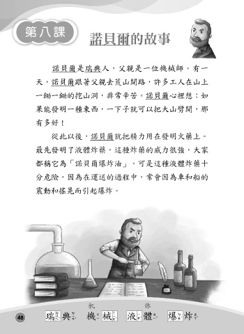 第八課 諾貝爾的故事 諾貝爾是瑞典人,父親是一位機械師。有一 天,諾貝爾跟著父親去荒山開路,許多工人在山上 一鋤一鋤的挖山洞,非常辛苦。諾貝爾心裡想:如 果能發明一種東西,一下子就可以把大山劈開,那 有多好! 從此以後,諾貝爾就把精力用在發明火藥上。 最先發明了液體炸藥,這種炸藥的威力很強,大家 都稱它為「諾貝爾爆炸油」。可是這種液體炸藥十 分危險,因為在運送的過程中,常會因為車和船的 震動和搖晃而引起爆炸。 機 體 48 瑞典 機械 液體 爆炸