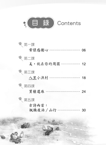 目 錄 Contents 第一課 常懷感謝心 ........................... . 06 第二課 美,就在你的周圍 ................. . 12 第三課 八里小漁村 ........................... . 18 第四課 買櫝還珠 .............................. . 24 第五課 古詩兩首: 楓橋夜泊/山行 .................... . 30