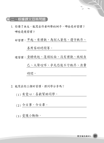 二、 根據課文回答問題 1. 你讀了本文,能寫出作者所舉的例子,哪些是好習慣? 哪些是壞習慣? 早起、有禮貌、為別人著想、遵守秩序、 好習慣: 善用零碎時間等。 貪睡晚起、蓬頭垢面、沒有禮貌、放縱自 壞習慣: 己、大聲喧嘩、爭先恐後不守秩序、浪費 時間。 2. 能寫出你三個好習慣,跟同學分享嗎? 有愛心,喜歡幫助同學。 (1) 今日事,今日畢。 (2) 愛護小動物。 (3) 華文補充教材3 59