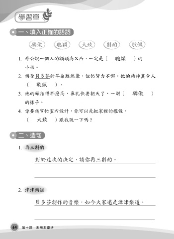 學習單 一、填入正確的語詞 驕傲 聰穎 大致 斟酌 敬佩 1. 外公說一個人的額頭高又凸,一定是( )的 聰穎 小孩。 2. 樂聖貝多芬的耳朵雖然聾,但仍努力不懈,他的精神真令人 敬佩 ( )。 驕傲 3. 他的頭抬得那麼高,鼻孔快要朝天了,一副( ) 的樣子。 4. 你要我幫忙室內設計,你可以先把家裡的擺設, 大致 ( )跟我說一下嗎? 二、造句 1. 再三斟酌 對於這次的決定,請你再三斟酌。 2. 津津樂道 貝多芬創作的音樂,如今大家還是津津樂道。 64 第十課 愈用愈靈活