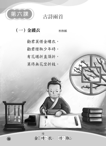第六課 古詩兩首 (一)金縷衣 杜秋娘 勸君莫惜金縷衣, 勸君惜取少年時。 有花堪折直須折, 莫待無花空折枝。 縷 36 金縷衣 惜取