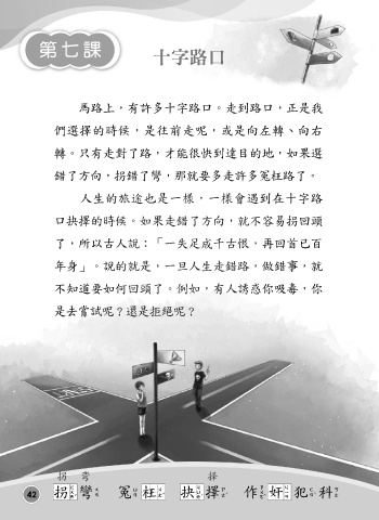 第七課 十字路口 馬路上,有許多十字路口。走到路口,正是我 們選擇的時候,是往前走呢,或是向左轉、向右 轉。只有走對了路,才能很快到達目的地,如果選 錯了方向,拐錯了彎,那就要多走許多冤枉路了。 人生的旅途也是一樣,一樣會遇到在十字路 口抉擇的時候。如果走錯了方向,就不容易拐回頭 了,所以古人說:「一失足成千古恨,再回首已百 年身」。說的就是,一旦人生走錯路,做錯事,就 不知道要如何回頭了。例如,有人誘惑你吸毒,你 是去嘗試呢?還是拒絕呢? 拐 彎 擇 42 拐彎 冤枉 抉擇 作奸犯科