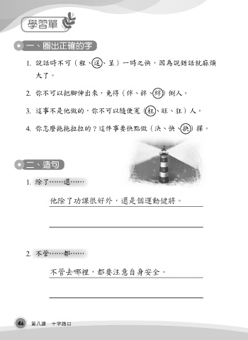 學習單 一、圈出正確的字 1. 說話時不可(程、逞、呈)一時之快,因為說錯話就麻煩 大了。 2. 你不可以把腳伸出來,免得(伴、拌、絆)倒人。 3. 這事不是他做的,你不可以隨便冤(枉、旺、狂)人。 4. 你怎麼拖拖拉拉的?這件事要快點做(決、快、抉)擇。 二、造句 1. 除了⋯⋯還⋯⋯ 他除了功課很好外,還是個運動健將。 2. 不管⋯⋯都⋯⋯ 不管去哪裡,都要注意自身安全。 46 第八課 十字路口