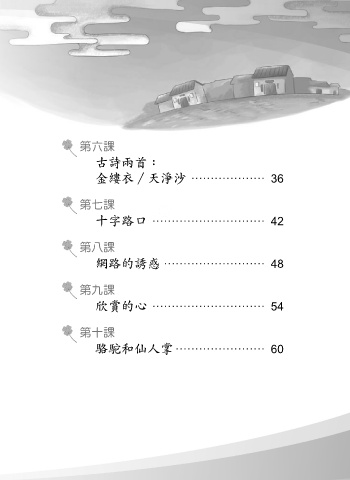 第六課 古詩兩首: . 36 金縷衣/天淨沙 .................... 第七課 . 42 十字路口 .............................. 第八課 . 48 網路的誘惑 ........................... 第九課 . 54 欣賞的心 .............................. 第十課 . 60 駱駝和仙人掌 . .......................