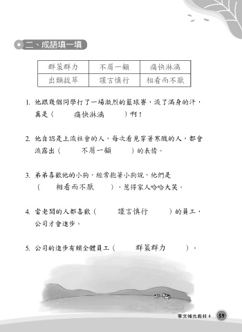 二、成語填一填 群策群力 不屑一顧 痛快淋漓 出類拔萃 謹言慎行 相看而不厭 1. 他跟幾個同學打了一場激烈的籃球賽,流了滿身的汗, 痛快淋漓 真是( )啊! 2. 他自認是上流社會的人,每次看見穿著寒酸的人,都會 不屑一顧 流露出( )的表情。 3. 弟弟喜歡他的小狗,經常抱著小狗說,他們是 相看而不厭 ( ),惹得家人哈哈大笑。 謹言慎行 4. 當老闆的人都喜歡( )的員工, 公司才會進步。 群策群力 5. 公司的進步有賴全體員工( )。 華文補充教材4 59