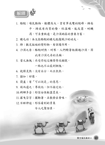 2. 睫毛功:本文指駱駝的睫毛能擋風沙的功夫。