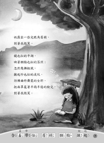 祇露出一些兒眼角眉梢, 對著我微笑。 鏡也似的平湖, 映著胭脂也似的落照; 忽然幾拂輕風, 皺起紗也似的波紋, 彷彿曲終舞罷的女郎, 把面罩籠著半嬌半倦的臉兒, 對著我微笑。 羞 帶 皺 起 含羞帶怯 眉梢 胭脂 皺起 7