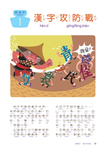 總複習 1 漢字攻防戰 原本平靜的漢字世界, 出現了五個正義之士 ─ 突然掀起了正邪大戰!邪 、日、艸、糸、火。這 惡的神祕人物想要把漢字 五個部首是著名的變裝高 隹、氏、青、袁、少、勺 手,在他們的巧手之下, 、西變不見。 隹、氏、青、袁、少、勺 正當這七人不斷被追殺 、西變成了新的字,有了 ,正要落入魔掌時,幸好 新的身分,躲避了危險。 總複習 1 漢字攻防戰 25