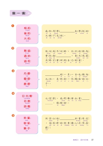 填一填 1 相約 我和同學 在學校的 條約 大樹下見面。 大約 2 難過 秋天或冬天時,北方的候鳥 過來 會往南 ,春天或夏 過冬 天時才會回到自己的家。 3 月曆 的一月一日也稱為 國曆 元旦,是新的一年開始的日 農曆 子。 4 日光燈 元宵節,我們都會去賞 花燈 、猜燈謎。 路燈 5 茶葉 阿里山的 非常有名 樹葉 ,泡茶時的清香讓人非常喜 葉子 歡! 總複習 1 漢字攻防戰 27
