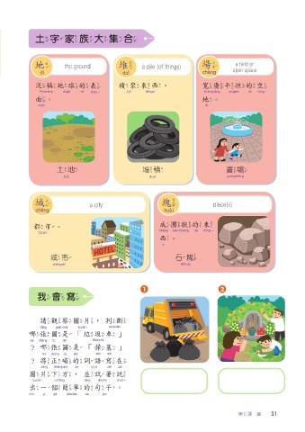 土字家族大集合 地 the ground 堆 a pile (of things) 場 a field or 地 堆 場 open space 泛稱地球的表 積聚東西。 寬廣平坦的空 面。 地。 土地 堆積 廣場 城 a city 塊 piece(s) 成 塊 都市。 成團狀的東 西。 城市 石塊 1 2 我會寫 請觀察圖片,判斷 哪張圖是「垃圾車」 ?哪張圖是「掃墓」 ?將正確的詞語寫在 圖片下方,並試著說 出一個簡單的句子。 第 6 課 墓 31