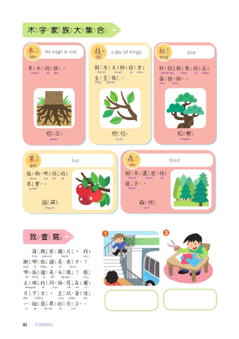 木字家族大集合 本 the origin or root 枝 a pile (of things) 松 pine 本 枝 松 草木的根。 樹木主幹的旁 針狀樹葉的長 生莖條。 壽植物。 根本 樹枝 松樹 果 fruit 森 forest 果 森 植物所結的 樹木濃密的 果實。 樣子。 蘋果 森林 1 2 我會寫 請觀察圖片,判 斷哪張圖是桌子? 哪張圖是天橋?將 正確的詞語寫在圖 片下方,並試著造 一個簡單的句子。 40 文字好好玩