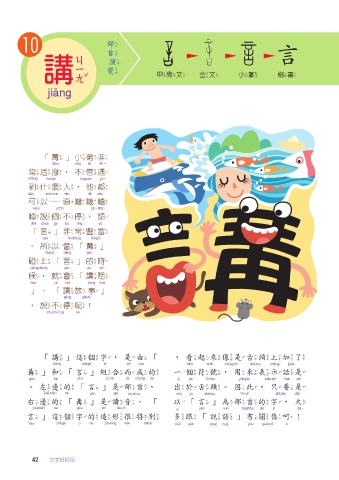 10 部首演變 講 甲骨文 金文 小篆 楷書 講 「冓」小弟非 常活潑,不管遇 到什麼人,他都 可以一直嘰嘰喳 喳說個不停,語 「言」非常豐富 。所以當「冓」 碰上「言」的時 候,就會「講話 」、「講故 」 ,說不停呢! 「講」這個字,是由「 ,看起來像是舌頭上加了 冓」和「言」組合而成的 一個符號,用來表示話是 。左邊的「言」是部首, 出於舌頭。因此,只要是 右邊的「冓」是讀音。「 以「言」為部首的字,大 言」這個字的造形很特別 多跟「說話」有關係呵! 42 文字好好玩