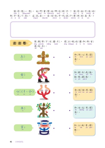 請你想一想,他們會變成哪些新字?請你把可能的 新字寫下來,並且查一查這些字代表什麼新的意思? 請觀察下方圖片,將正確的圖和部首 連連看 連起來。 和內心有關 土 係。 和樹木或植 女 物有關係。 心( ) 和說話有關 係。 木 和女生有關 係。 言 和土地有關 係。 46 文字好好玩