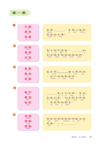 填一填 1 古墓 清明 ,是華人慎終 墓地 追遠的美德。 掃墓 2 奶媽 每次回外婆家, 和 舅媽 表哥總是熱情款待我們。 姑媽 3 喜愛 他非常 讀文學作品 愛惜 ,從小就熟讀唐詩。 慈愛 4 梅花 有五片花瓣,有白 梅酒 色或紅色,代表堅貞耐寒 梅乾 ,是我們的國花。 5 演講 老師針對同學們所提出的 講解 問題,一一 。 講臺 總複習 2 勇士變身記 47