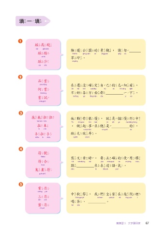 填一填 1 踩高蹺 維護公園的景觀,請勿 踩踏 草坪。 踩沙 2 品嘗 在還沒確定自己的志向前, 何嘗 不妨各方面都 一下。 嘗試 3 拖拖拉拉 他動作很慢,就是個慢郎中 拉車 ,做起事來總是 的, 手拉手 缺乏效率。 4 符號 寫文章時,要正確的使用標 符合 點 來表達語氣。 鬼畫符 5 賞月 中秋節,我們全家在庭院裡 三月 喝茶、 。 蜜月 總複習 3 文字要回家 67