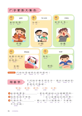 疒 床字家族大集合 pain to cure crazy 痛的感覺。 治病。 精神失常。 疼痛 治療 發瘋 illness scar 身體不舒適 傷疤。 的現象。 生病 傷痕 Reminder 疒 床的位置通常在最外圍呵! 下列的字都是同音字,選出正確的答 同音字 案填在空格裡。 嘹亮 遼闊 潦草 工寮 治療 1 他的歌聲真 ,連在對面的山谷都聽得到。 2 這封信的字跡很 ,沒人看懂他在寫什麼。 3 大海非常 ,讓人看了心情很好,不會再 斤斤計較。 74 文字好好玩