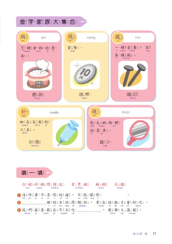 金字家族大集合 pot money iron 金文 小篆 楷書 烹調食物的器 貨幣。 一種金屬,容 具。 易傳熱。 飯鍋 錢幣 鐵釘 needle mirror 細長尖銳的 能反映物體 工具。 的器具。 針筒 鏡子 填一填 打破砂鍋問到底 背黑鍋 飯鍋 火鍋 1 這件事不是你的錯,不能讓你 。 2 裡的水放得剛好,煮出的飯才會好吃。 3 我們最喜歡在冬天吃 ,歡樂又溫暖。 第 18 課 鍋 77