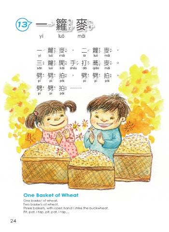 13 一 籮麥 一 籮麥 一 籮麥,二籮麥, 一籮麥 二籮麥 三籮開手打蕎麥。 三籮開手打蕎麥 劈劈拍,劈劈拍, 劈劈拍 劈劈拍 劈劈拍 …… 劈劈拍 One Basket of Wheat One basket of wheat, Two baskets of wheat, Three baskets, with open hand I strike the buckwheat. Pit, pat, I tap, pit, pat, I tap.... 24
