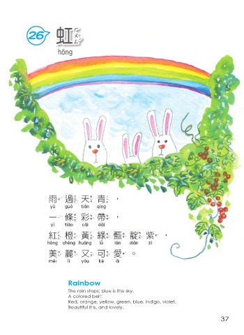 26 虹 虹 雨過天青, 雨過天青 一 條彩帶, 一條彩帶 紅橙黃綠藍靛紫, 紅橙黃綠藍靛紫 美麗又可愛。 美麗又可愛 Rainbow The rain stops; blue is the sky. A colored belt: Red, orange, yellow, green, blue, indigo, violet. Beautiful it is, and lovely. 37