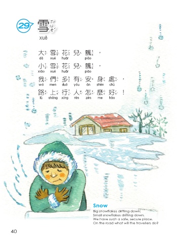 29 雪 雪 大雪花 兒 飄, 大雪 飄 小雪花 兒 飄, 小雪 飄 我 們 多有安身處, 我們多有安身處 路上行人怎麼好! 路上行人怎麼好 Snow Big snowflakes drifting down; Small snowflakes drifting down. We have such a safe, secure place. On the road what will the travellers do? 40