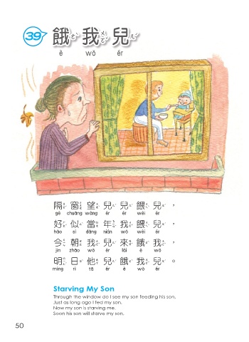 39 餓我兒 餓我兒 隔窗望兒兒餵兒, 隔窗望兒兒餵兒 好似當年我餵兒, 好似當年我餵兒 今朝我兒來餓我, 今朝我兒來餓我 明日他兒餓我兒。 明日他兒餓我兒 Starving My Son Through the window do I see my son feeding his son, Just as long ago I fed my son. Now my son is starving me. Soon his son will starve my son. 50