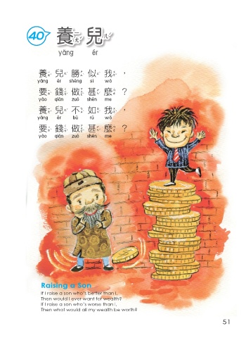 40 養兒 養兒 養兒勝似我, 養兒勝似我 要錢做甚麼? 要錢做甚麼 養兒 不 如我, 養兒不如我 要錢做甚麼? 要錢做甚麼 Raising a Son If I raise a son who’s better than I, Then would I ever want for wealth? If I raise a son who’s worse than I, Then what would all my wealth be worth? 51