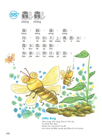 55 蟲蟲 蟲蟲 蟲,蟲,蟲,蟲, 蟲 蟲 蟲 蟲 飛,飛到天上喝 露 水, 飛 飛到天上喝露水 露 水喝個飽, 露水喝個飽 抱著小頭往家跑。 抱著小頭往家跑 Little Bug Little bug, little bug, flies to the sky To drink the dew. When he has drunk his fill, He holds his little head and flies to his home. 66
