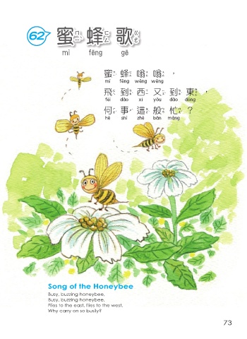 62 蜜蜂歌 蜜蜂歌 蜜蜂嗡嗡, 蜜蜂嗡嗡 飛到西又到東, 飛到西又到東 何事這般忙? 何事這般忙 Song of the Honeybee Busy, buzzing honeybee, Busy, buzzing honeybee, Flies to the east, flies to the west. Why carry on so busily? 73