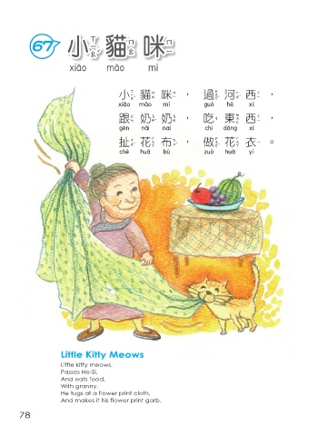 67 小貓咪 小貓咪 小貓咪,過河西, 小貓咪 過河西 跟奶 奶 ,吃東 西 , 跟奶奶 吃東西 扯花布,做花衣。 扯花布 做花衣 Little Kitty Meows Little kitty meows, Passes He-Si. And eats food, With granny. He tugs at a flower print cloth, And makes it his flower print garb. 78