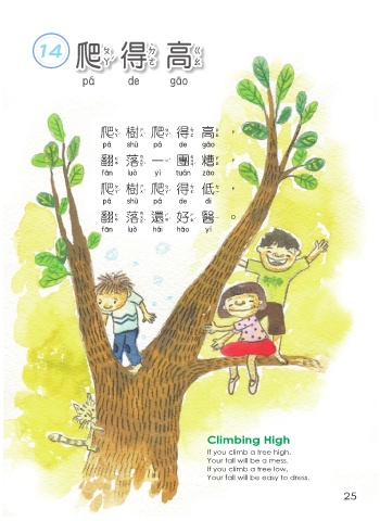 14 爬 得 高 爬 得 高 爬樹爬 得 高, 爬樹爬得高 翻落 一 團糟, 翻落一團糟 爬樹爬 得 低, 爬樹爬得低 翻落還好醫。 翻落還好醫 Climbing High If you climb a tree high, Your fall will be a mess. If you climb a tree low, Your fall will be easy to dress. 25