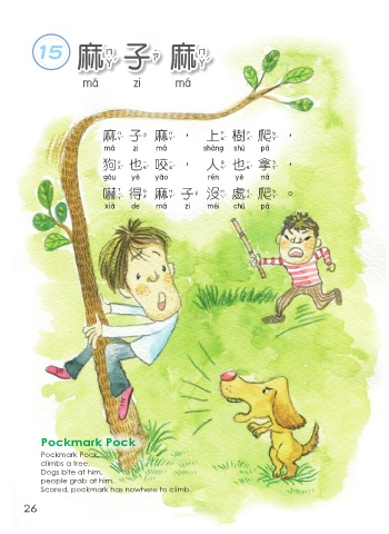 15 麻 子 麻 麻 子 麻 麻 子 麻,上樹爬, 麻子麻 上樹爬 狗也咬,人也拿, 狗也咬 人也拿 嚇 得 麻 子 沒處爬。 嚇得麻子沒處爬 Pockmark Pock Pockmark Pock, climbs a tree. Dogs bite at him, people grab at him. Scared, pockmark has nowhere to climb. 26