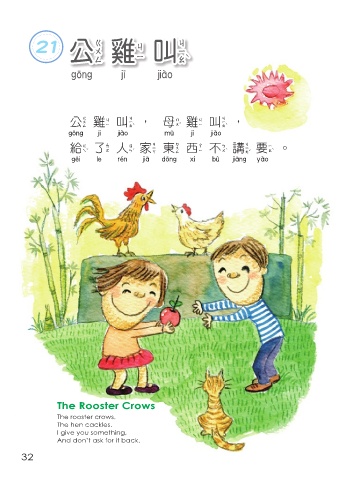 21 公雞叫 公雞叫 公雞叫,母雞叫, 公雞叫 母雞叫 給了人家東 西不 講要。 給了人家東西不講要 The Rooster Crows The rooster crows. The hen cackles. I give you something, And don’t ask for it back. 32