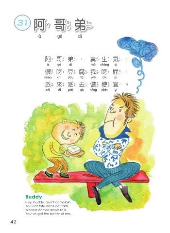 31 阿哥弟 阿哥弟 阿哥弟,莫生氣, 阿哥弟 莫生氣 儂吃豆腐我吃屁, 儂吃豆腐我吃屁 派來派去儂 便 宜。 派來派去儂便宜 Buddy Hey, buddy, don’t complain. You eat tofu and I eat farts. When it comes down to it, You’ve got the better of me. 42