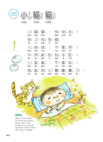35 小貓貓 小貓貓 小貓貓,快快來! 小貓貓 快快來 來了快洗臉, 來了快洗臉 小娃 娃 ,不要哭! 小娃哇 不要哭 不 哭給你包 子 吃。 不哭給你包子吃 小家雀,不要叫! 小家雀 不要叫 我家的小寶睡 覺 了。 我家的小寶睡覺了 Kitty Kitty, come here! I’ll wash your face, Dolly, don’t cry! I’ll give you a treat. Sparrow, don’t chirp! My baby’s asleep. 46