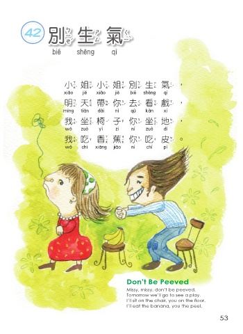 42 別生氣 別生氣 小姐小姐別生氣, 小姐小姐別生氣 明天帶你去看戲, 明天帶你去看戲 我坐椅 子 你坐地, 我坐椅子你坐地 我吃香蕉你吃皮。 我吃香蕉你吃皮 Don’t Be Peeved Missy, missy, don’t be peeved. Tomorrow we’ll go to see a play. I’ll sit on the chair, you on the floor. I’ll eat the banana, you the peel. 53