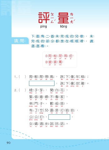 評量 評量 評 量 下面有二首未完成的兒歌,未 請問 完成的部分都放在框框裡,請 選選看。 爬樹爬得低 爬樹爬 得 低 婆婆罵 婆 婆 罵 1.( )爬樹爬得高,跌下像年糕; 爬樹爬 得 高 跌下像年糕 ,跌下像田雞。 跌下像田雞 2.( )棱子芽,開白花, 棱 子 芽 開白花 娶個媳婦不看家, 娶個媳婦 不看 家 串門子,數板搭, 串門 子 數 板搭 有了空兒還是打哈哈, 有了 還是打哈哈 公 公打, , 公 公 打 女婿過來說好話。 女婿過來說好話 90