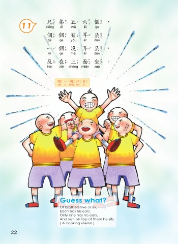 兄弟五六個, 11 兄弟五六個 個 個有耳 朵 , 個個有耳朵 一個沒耳 朵 , 一個沒耳朵 反在上面坐。 反在上面坐 猜 一 種炊具 猜一種炊具 Guess what? Of brothers five or six, Each has his ears. Only one has no ears, And yet, on top of them he sits. ( A cooking utensil ) 22