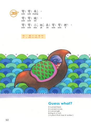 彎彎床, 39 彎彎床 彎彎被, 彎彎被 彎彎小姐在彎彎裡。 彎彎小姐在彎彎裡 猜 一 種水生植物 猜一種水生植物 Guess what? A curved bed, A curved cover, A curved girl, Living in a curl. ( A plant that lives in water ) 50