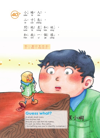 小矮人, 40 小矮人 二寸長, 二寸長 問他名 和 姓, 問他名和姓 和 我一個樣。 和我一個樣 猜 一 種日常用品 猜一種日常用品 Guess what? A small, short man, Two inches tall. Should you ask him his name, It’s just, as mine, the same. ( Something we use to identify ourselves ) 51